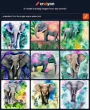 | 21:32, 7 September 2022 | Craiyon a elephant into the jungle space watercolor.png (file) | 1.28 MB | 1 | ||