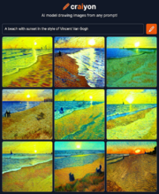 | 21:20, 7 September 2022 | Craiyon 231109 A beach with sunset in the style of Vincent Van Gogh.png (file) | 1.38 MB | 2 | ||
